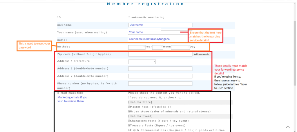 Type your name in the first box to match what you’ve given your forwarder then in the next box, “furigana” will be required. This is used for reading kanji accurately in a regular Japanese name. Your name is easy to generate using an online tool (I used this) Once converted, your name should be accepted by the system! If errors occur complaining about “kana”, remove any spaces added by the tool.