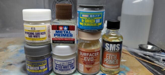 Surfacers can be marketed with primer functions (See Mr Color’s Mr Base Primer or regular hardware store brands that sell “primer and filler” spray cans). This is where my confusion on the topic began and why I thought it might be useful for me to type my findings out here.